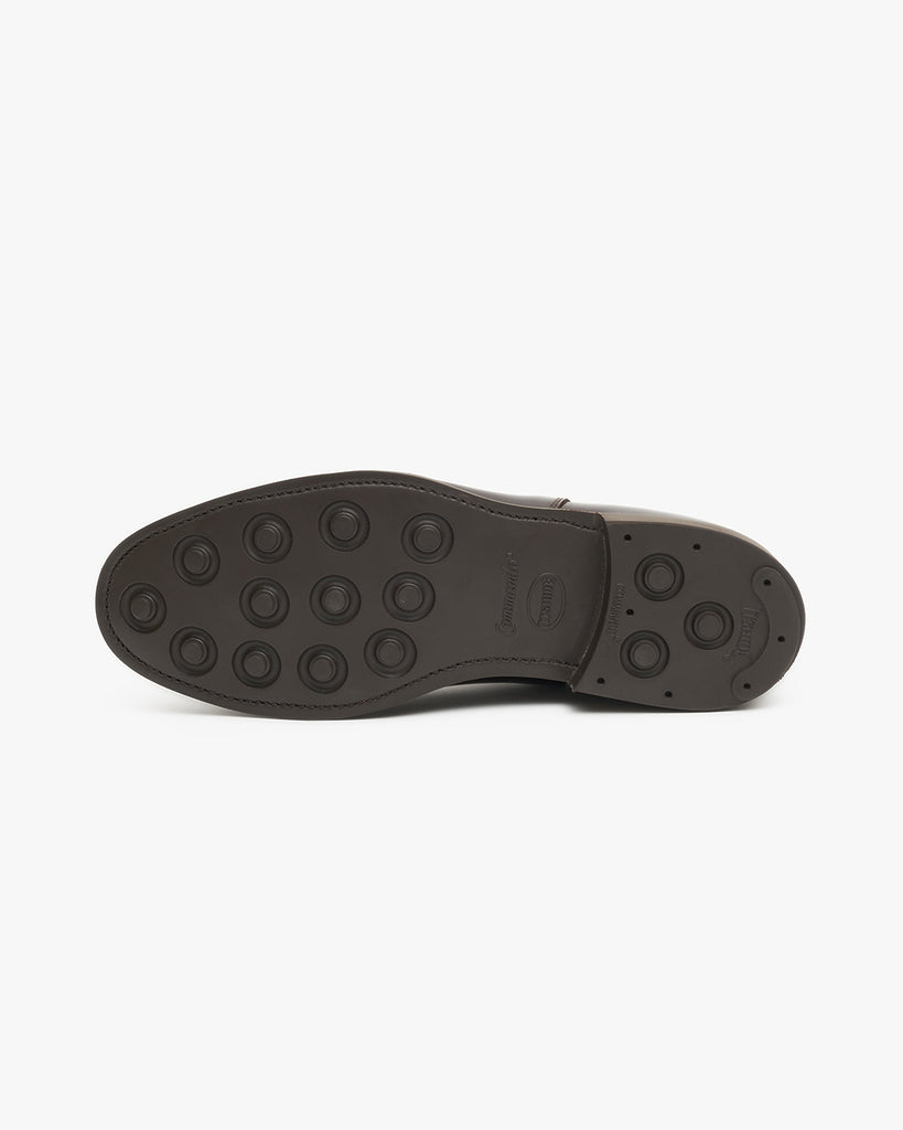 アッパーはポリッシュドレザー仕様。光沢感があり傷や汚れが付きにくく、比較的雨にも強いのが特徴です。ブラッシングの後、少量の水を含ませた柔らかい布で磨いて頂くと光沢感が保てます。簡単にお手入れができるため、革靴を初めて履く方へもおすすめです。
