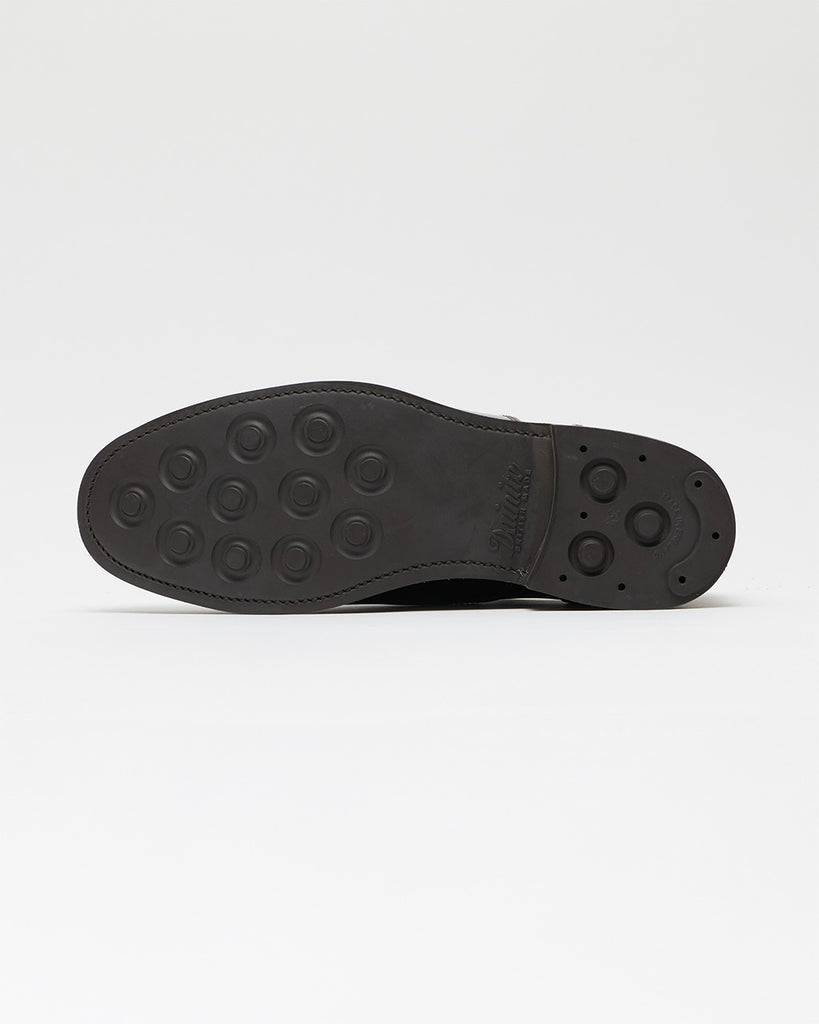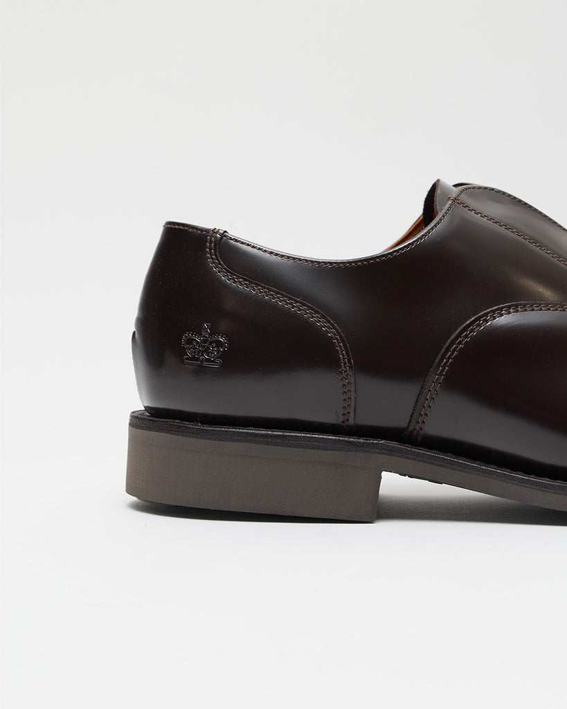 アッパーはポリッシュドレザー仕様。光沢感があり傷や汚れが付きにくく、比較的雨にも強いのが特徴です。ブラッシングの後、少量の水を含ませた柔らかい布で磨いて頂くと光沢感が保てます。簡単にお手入れができるため、革靴を初めて履く方へもおすすめです。