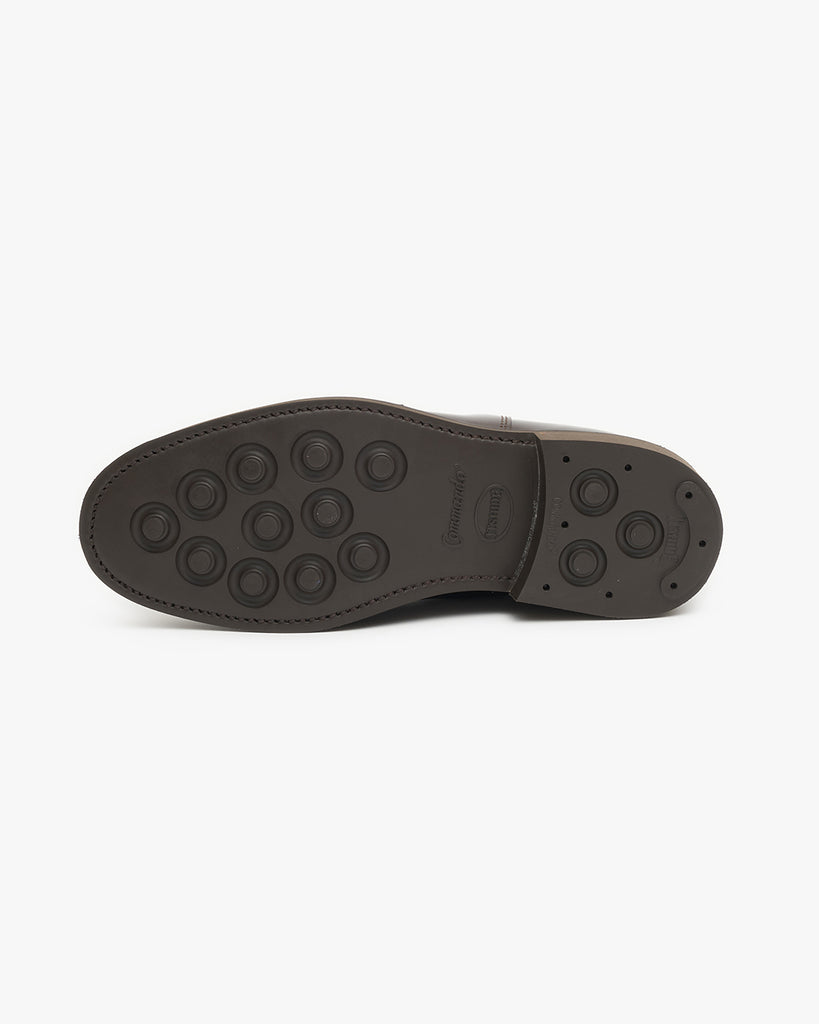 アッパーはポリッシュドレザー仕様。光沢感をがあり傷や汚れが付きにくく、比較的雨にも強いのが特徴です。ブラッシングの後、少量の水を含ませた柔らかい布で磨いて頂くと光沢感が保てます。簡単にお手入れができるため、革靴を初めて履く方へもおすすめです。