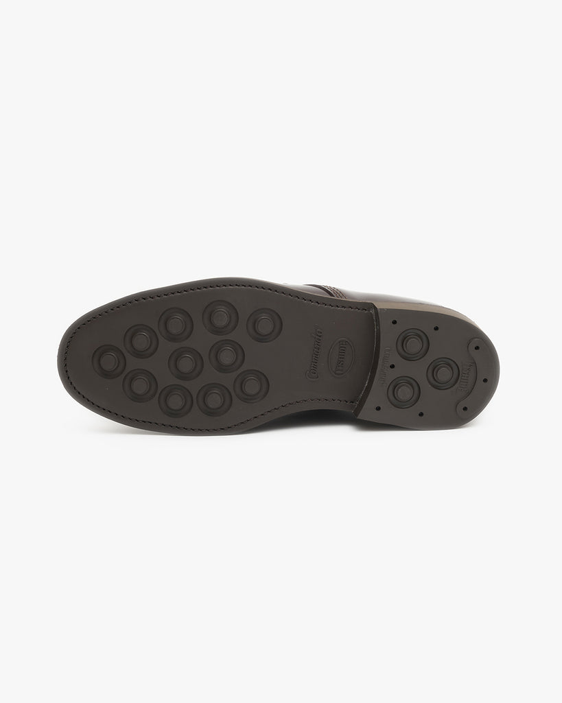 現在では希少となった3本針ミシンを使用した、別名ピューリタンステッチと呼ばれる、特徴的な3本のステッチラインがトウキャップと羽根部分に施されています。ヒール部分には英国ならではのクラウンマークを表現する事が許されています。