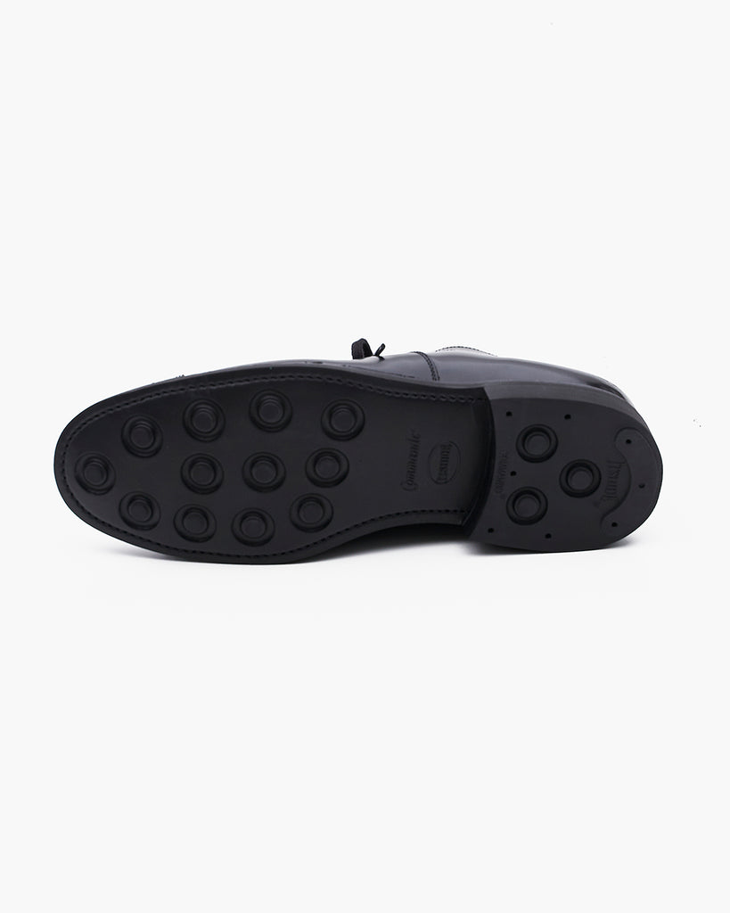 アッパーはポリッシュドレザー仕様。光沢感があり傷や汚れが付きにくく、比較的雨にも強いのが特徴です。ブラッシングの後、少量の水を含ませた柔らかい布で磨いて頂くと光沢感が保てます。簡単にお手入れができるため、革靴を初めて履く方へもおすすめです。