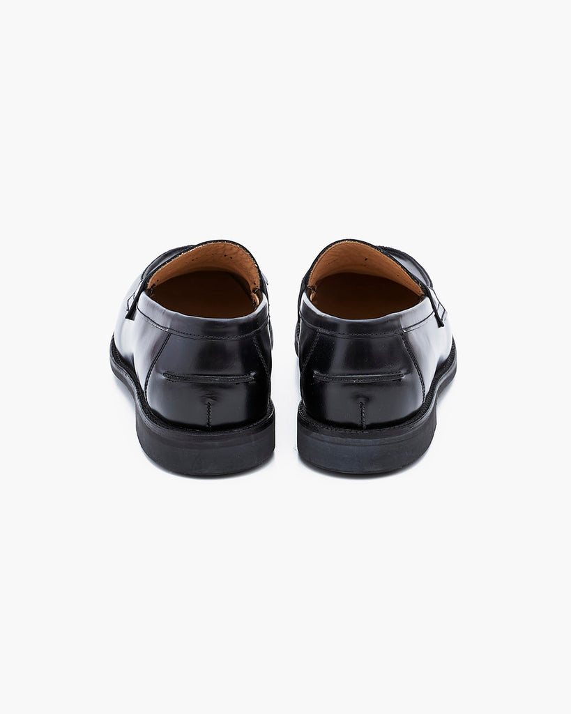 2枚の革を突き合わせ縫いにて縫い上げていることに由来します。合わせるボトムを選ばず、脱ぎ履きがしやすいため様々なシチュエーションで使用できます。インソールに採用されているPORON®は衝撃吸収性に優れるほか、人間の体温付近で抜群のフィット感を発揮します。また長期間の圧縮に対しても高い復元性を発揮するため耐久性も高く着用いただけます。