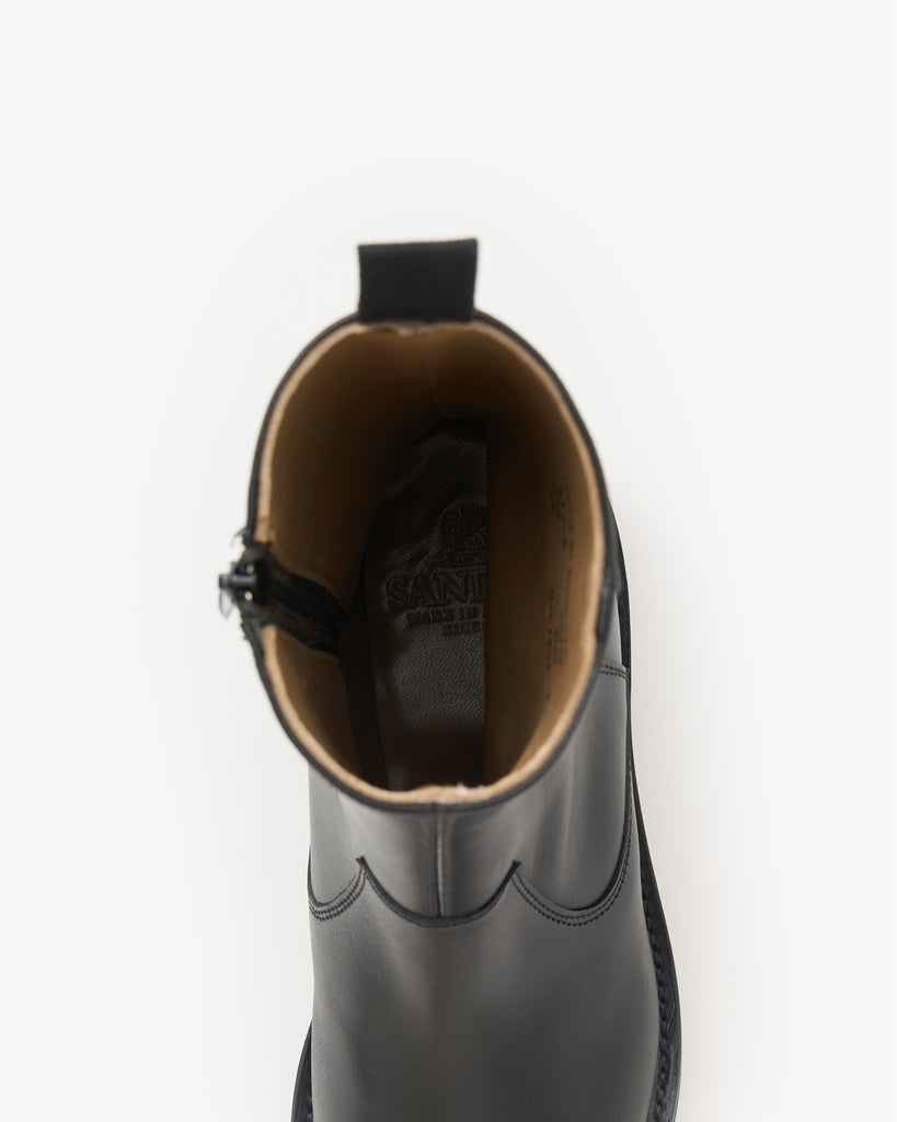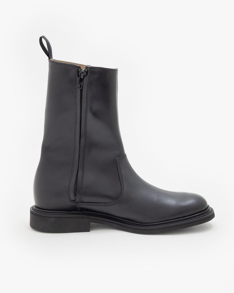 トゥにかけてスッキリしたフォルムと、内側のサイドジッパーが印象的なモデル。ジッパーでの着脱のため見た目とは裏腹に着用もスムーズに行えるのも特徴です。